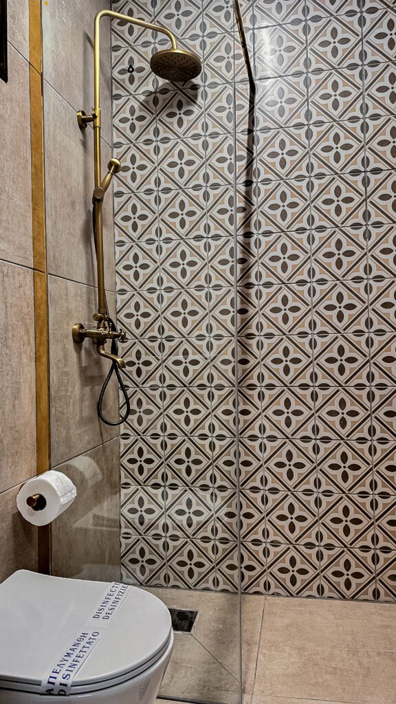 A spacious bathroom with a walk-in shower, golden accents, and intricate mosaic tiles.
