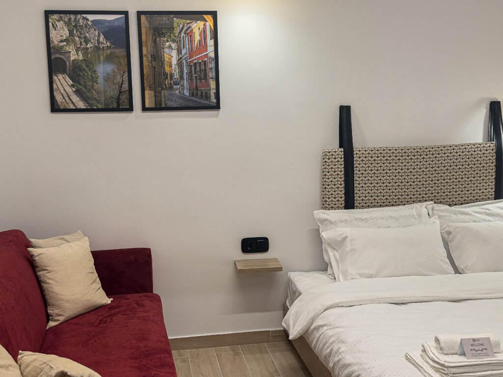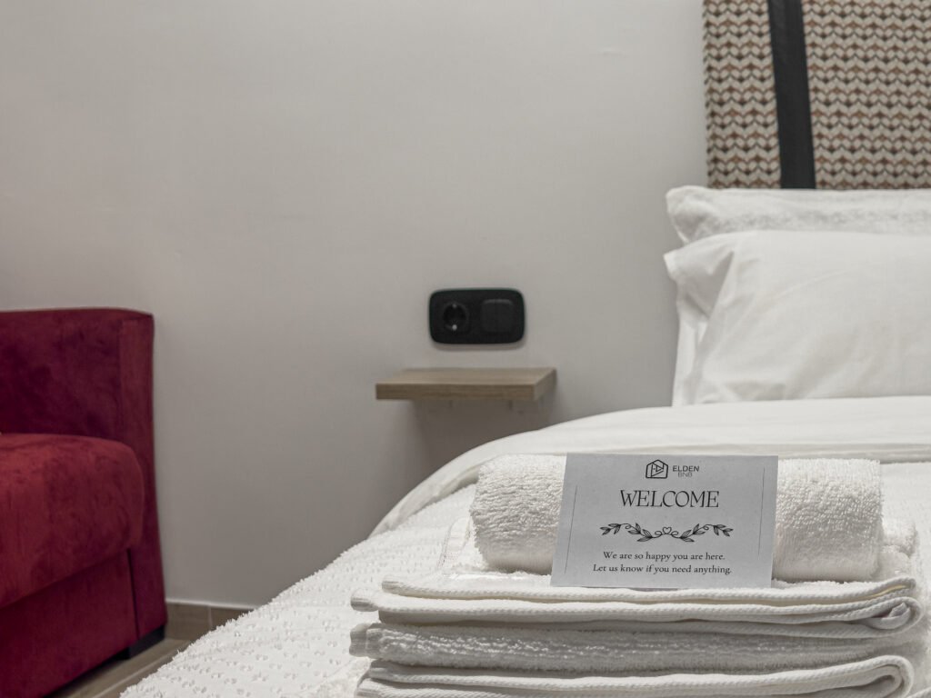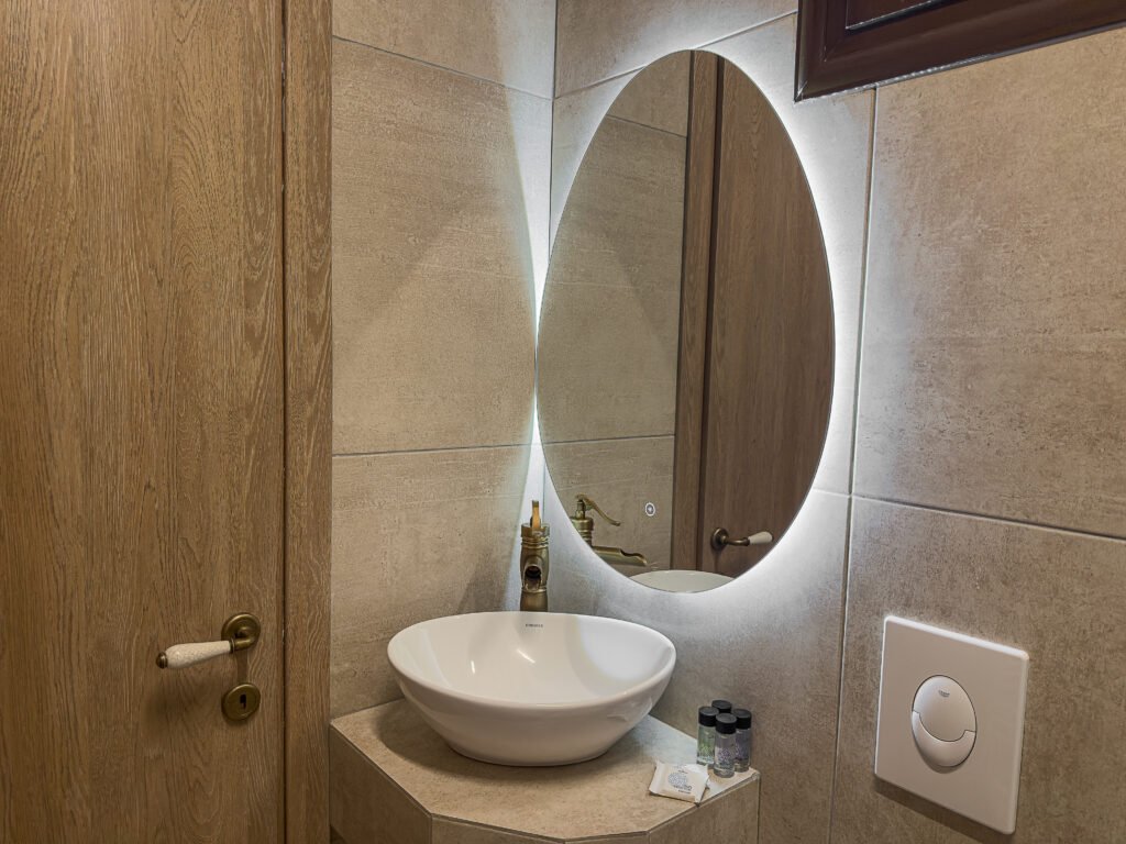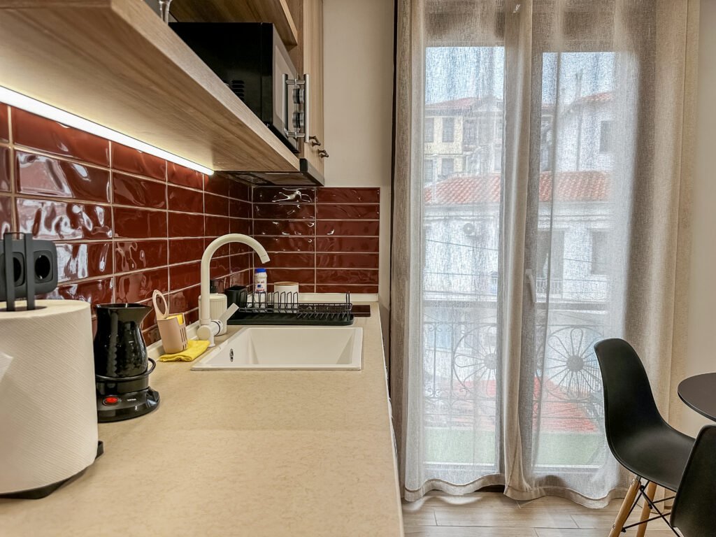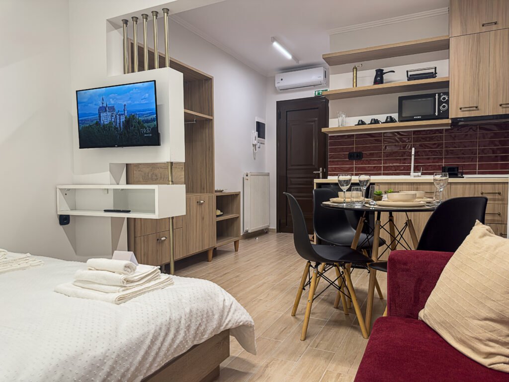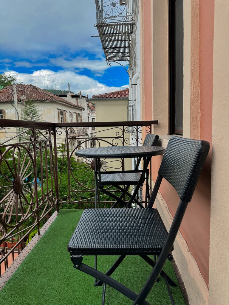 The warm tones, natural textures, and elegant decor create a tranquil retreat, blending contemporary design with timeless charm. Located on the first floor, the room is ideal for exploring the Old Town of Xanthi, with its vibrant streets and historic atmosphere just steps away.