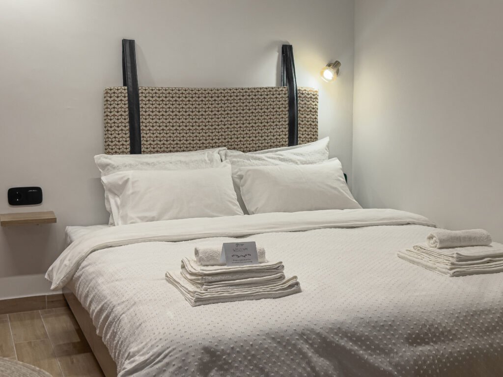 A comfortable double bed with premium bedding and a stylish headboard.